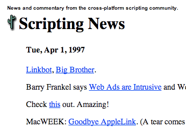 Dave Winer’s [Scripting News](http://scripting.com) turns 10 years old today. The screen shot at the left is what you see today, a snapshot of the weblog on it’s birthday. Dave even took the time to refresh the links–some going to the [Wayback Machine](http://web.archive.org) and others still up and working.