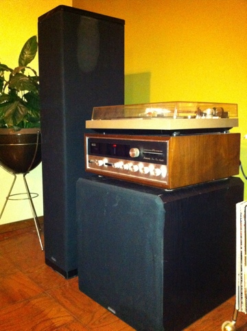 My brother-in-law Blair Smith found these Definitive Technologies speakers at an estate sake near his house. I won’t say how low the price was but call it less than a good dinner for two. This weekend we were in KC to see Blair and Mary, the kids plus Mary’s godfather Bob Jester and his wife Emilie. First thing I did was corral Blair and get the speakers moved to our car. Good news–they fit!